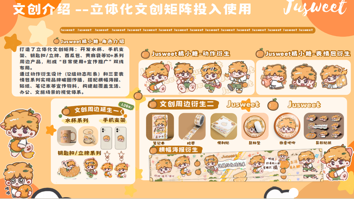 本次竞赛聚焦文化传承与科技创新,参赛作品涵盖文创产品设计、文旅路线规划等多元领域。其中,“橘小糖”实践团以“甜美产业青春赋能”为核心理念,为四会市黄田镇沙糖桔产业量身打造了IP形象“橘小糖”,突破传统农产品形象边界,构建起“农产品-地域文化-消费情感”的独特符号。
