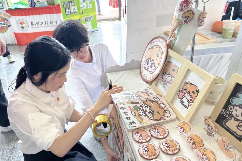 在竞赛成果展区,“橘小糖”IP以鲜明的视觉体系和实用场景覆盖力脱颖而出。团队精心布置文创矩阵展台。各省内高校参赛队伍纷纷前来交流,展台前一度排起长龙。师生们现场领取钥匙扣、胶带、笔记本等周边产品,手持“橘小糖”IP衍生品爱不释手。