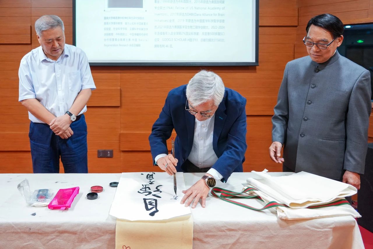 苏国辉院士挥毫赠与永利官网墨宝,胡军校长代表学校向苏国辉院士赠送刺绣。
