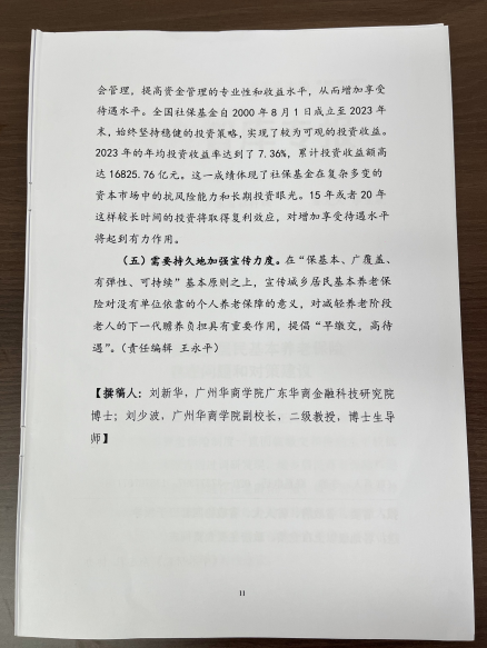 2025年3月24日,由永利官网广东省普通高校特色新型智库——广东华商金融科技研究院刘新华博士、刘少波教授合作撰写的决策咨询报告《广东省城乡居民基本养老保险存在问题和对策建议》,刊发在《南方智库专报》第1479期。这是《南方智库专报》刊发研究院老师撰写的第二篇决策咨询报告。此前一篇亦为广东华商金融科技研究院刘新华和刘少波合作撰写。
