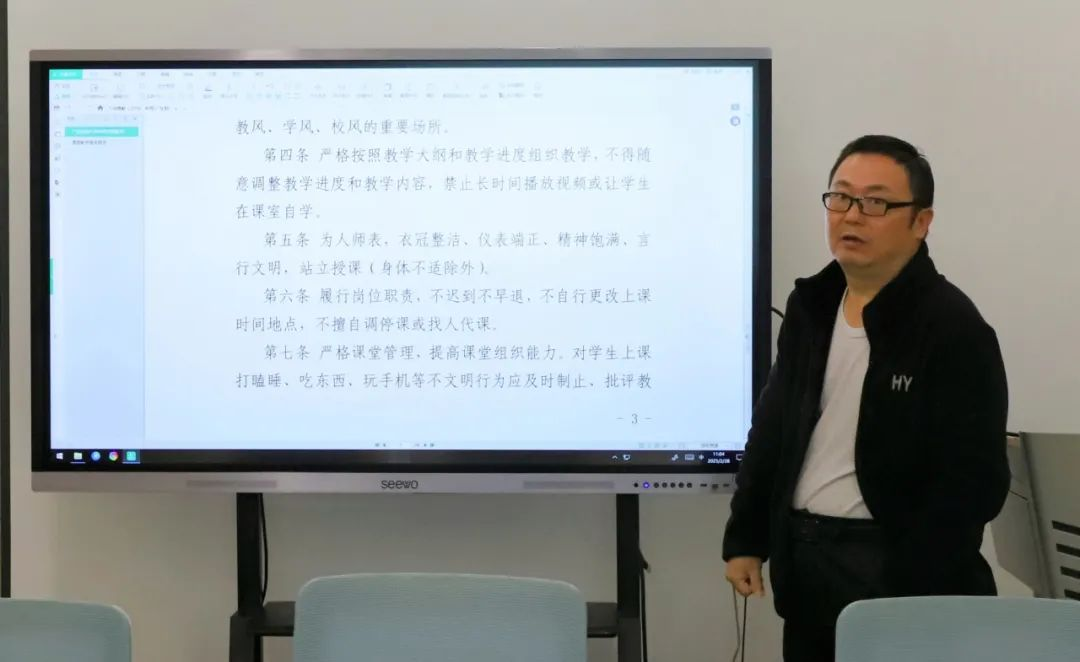 谢根仁院长助理传达教学制度相关文件精神。他表示,与会教师要坚定政治立场,遵守法律法规,严谨治学,严格按照教学大纲组织教学,不得随意调整教学进度和内容,注重仪表仪态,履行岗位职责,严格课堂管理并做好学生考勤。