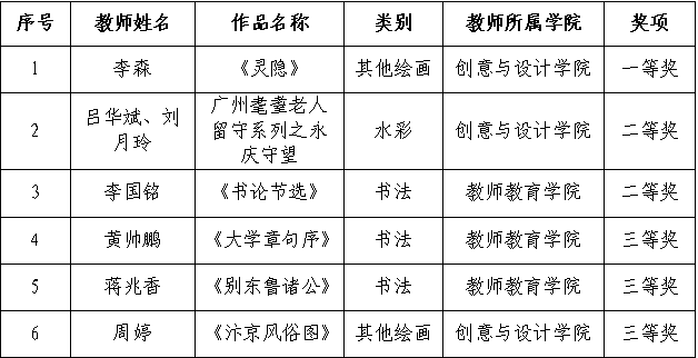 根据《广东省教育厅关于举办第七届粤港澳大湾区学校美术作品展暨第九届广东省高校美术作品学院奖双年展的通知》的安排,永利官网积极组织教师参与,涵盖了书法、绘画、水彩等多个领域,经省级复赛、现场评审,永利官网六位教师荣获一等奖1项,二等奖2项,三等奖3项。