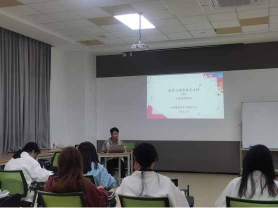 为推进永利官网心理健康教育工作,充分发挥朋辈心理咨询员队伍在永利官网心理健康教育工作中的积极作用,使其明确工作职责,提升工作能力,更好地服务广大师生,助力学生健康成长。2024年3-4月,肇庆校区心康中心面向新招募的朋辈心理咨询员开展了五次培训,有效提高朋辈心理咨询员的心理咨询素养和能力。本次系列培训由心康中心赖冠东老师担任培训主讲人,培训内容有小组读书分享、咨询基本技术学习、模拟咨询训练等。