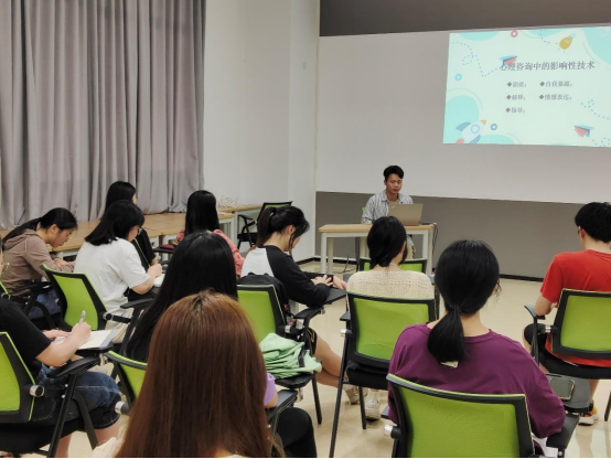 2024年3月26日,培训第四讲主题为《心理咨询的基本技术——影响性技术》。本次培训继续深入讲解心理咨询中的影响性技术:面质、解释、指导、自我暴露和情感表达技术。通过案例分析和小组讨论,让朋辈咨询员明确心理咨询技术有助于咨询员与来访者建立良好的咨询关系,了解了若咨询过程受到阻碍时,咨询员如何通过主动干预促进来访者的思考,推动本次心理咨询的进程。