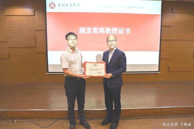 在与会人员的共同见证下,人事处处长彭强代表学校为黄锦良先生颁发客座教授聘书。