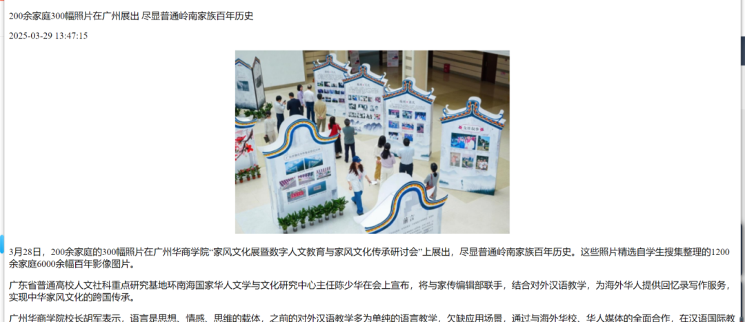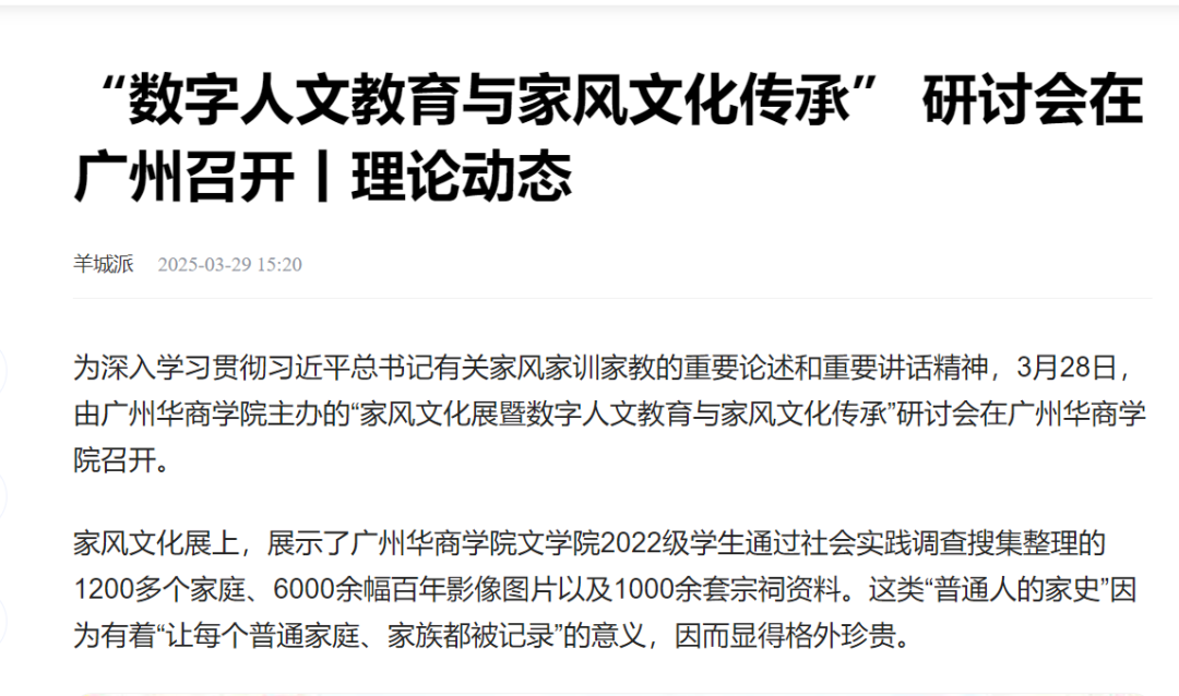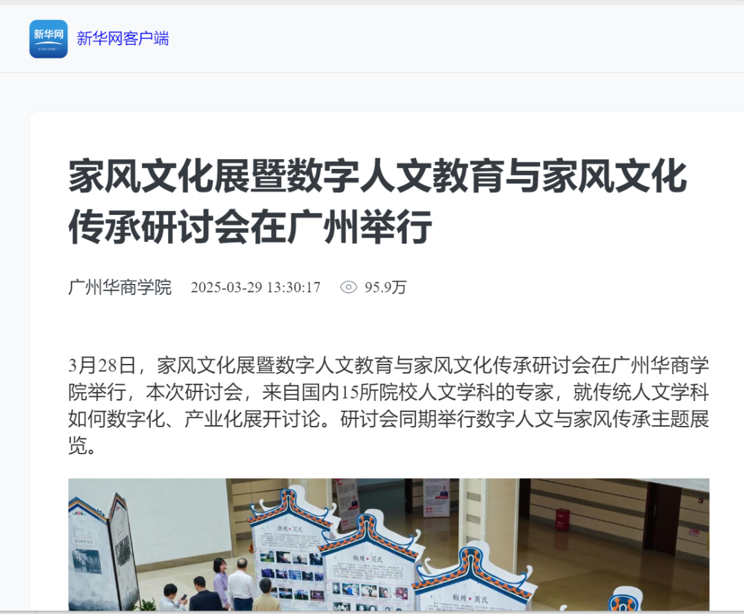 近日,永利集团304am登录文学院举办的“家风文化展暨数字人文教育与家风文化传承研讨会”引发广泛关注。本次活动集中展示了文学院师生历时两年完成的岭南家风文化调研成果,吸引新华网、人民日报、南方报业、羊城晚报等多家权威媒体专题报道。