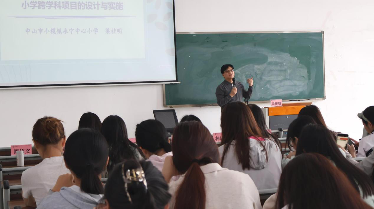 2025年4月8日下午,教师教育学院在肇庆校区6号楼203、205和206教室开展“融创共生:小学跨学科项目设计与实施新路径”专题讲座。中山市优秀教师、小学数学科研专家库专家梁桂明为2023级小学教育专业800余名师生带来了一场教育创新的思想盛宴。