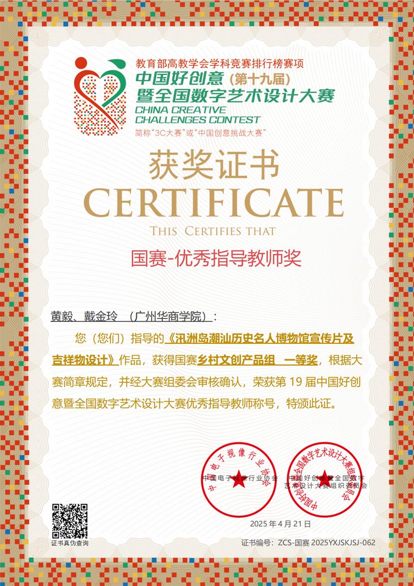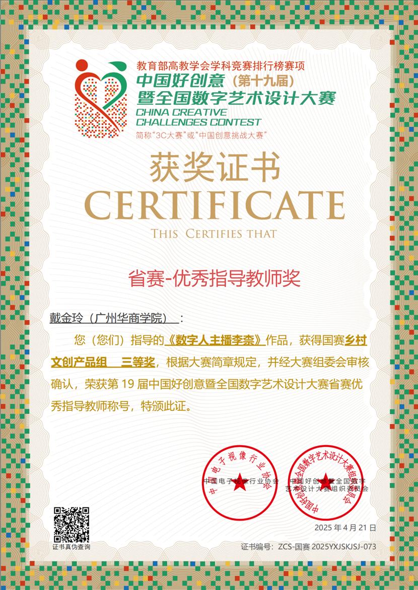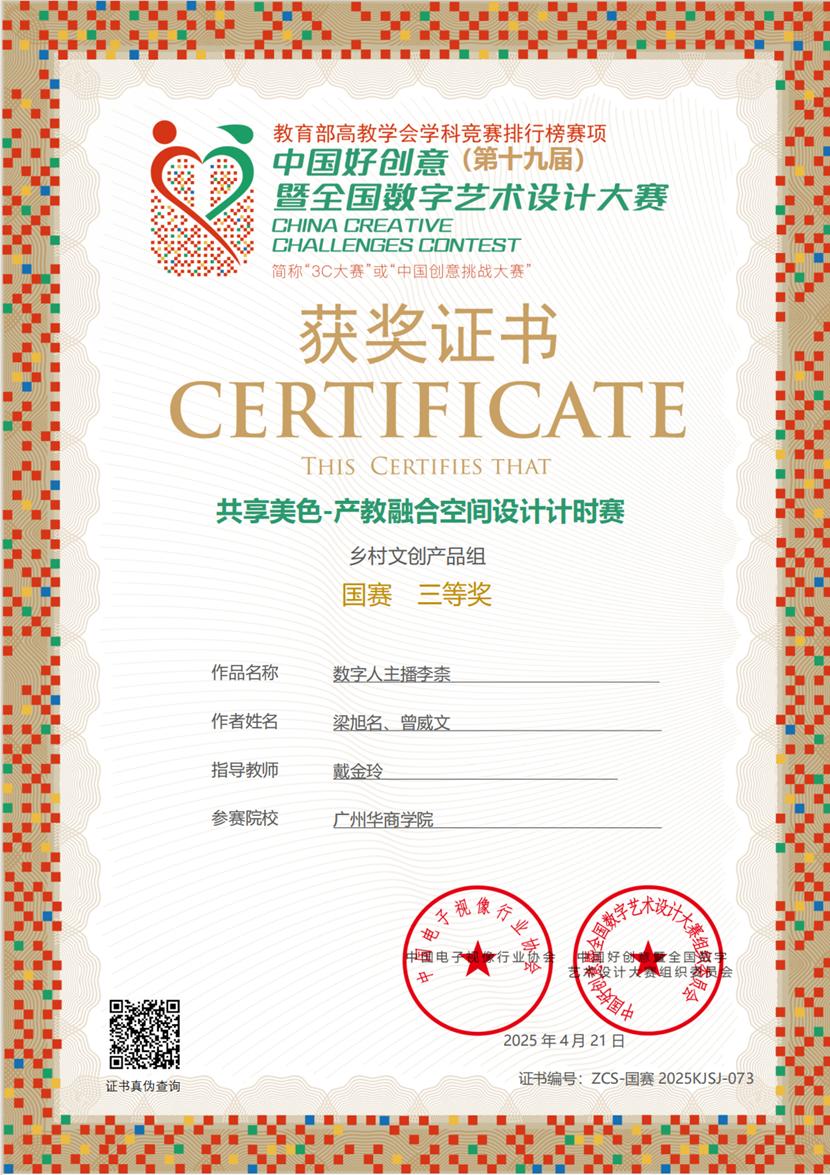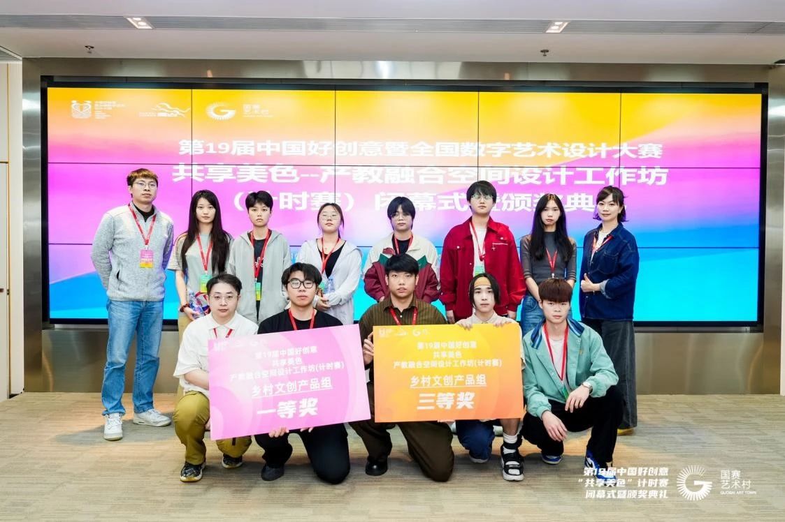 第十九届中国好创意暨全国高校数字艺术设计大赛国赛村基地活动“共享美色——产教融合空间设计工作坊”于2025年4月9日至13日在佛山市南海区狮山镇国赛村圆满收官。视频传播系主任戴金玲老师与黄毅老师、企业导师熊玉才共同指导,带领动画专业11名学子首次参加48小时AIGC赛道,实现零的突破。在48小时云端鏖战中,团队依托AIGC智能设计平台,最终在“乡村振兴”专项组斩获国家级一等奖1项、三等奖1项,以“AI创作设计+文化传承”的创新范式,体现出永利官网应用型人才培养的实践性。